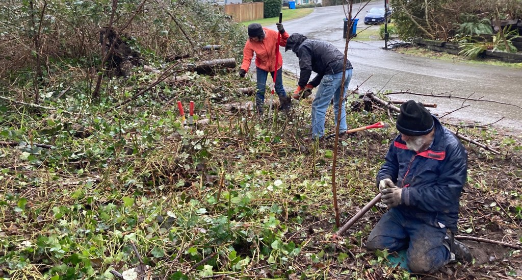 Our February work party was more rain than shine but we showed up and had a nice little troop of volunteers join us. We cleared another section of overgrown Himalayan blackberry bushes and English ivy.