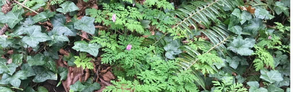 Upland sites are dominated by a mix of conifers, primarily DOUGLAS-FIR (Pseudotsuga menziesii) and to a lesser extent WESTERN HEMLOCK (Tsuga heterophylla), WESTERN REDCEDAR (Thuja plicata), and WESTERN WHITE PINE (Pinus monticola). Deciduous trees include BIGLEAF MAPLE (Acer macrophyllum). The shrub layer includes a mix of native and invasive species while the ground cover is dominated by the invasive ENGLISH IVY (Helix hedera), which has for the most part eliminated native understory grasses and wildflowers.