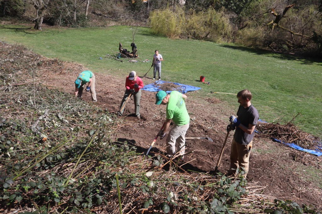 During the removal phase the majority of invasive plants are removed. It is critical to remove as much of the root stock as possible since many invasive species aggressively resprout from remaining material. Manual labor is used for initial removal and we heavily depend on volunteers during monthly work parties to accomplish much of this work. The two most pervasive species at Paramount are English ivy and Himalayan blackberry. Other common invasive species include sycamore maple, English laurel, and English holly.
